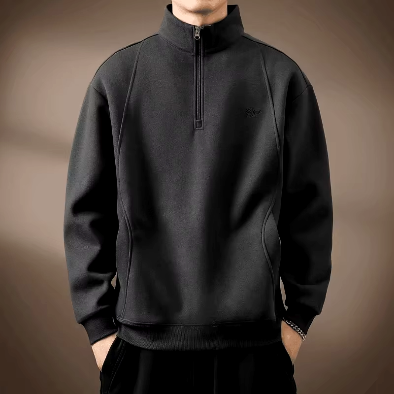 Structured seam detailing that sharpens the look, paired with a high collar for added warmth and a half-zip closure for easy wear. Soft structured fabric with a relaxed fit makes this pullover an everyday essential.