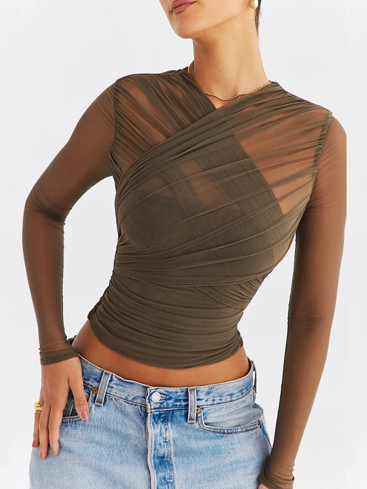 Stop staring, start wearing. Beautifully gathered and creatively layered, this top is designed to complement the body. Crafted from soft stretch sheer mesh, the body is partially lined in our special power mesh to enhance the figure-hugging fit.