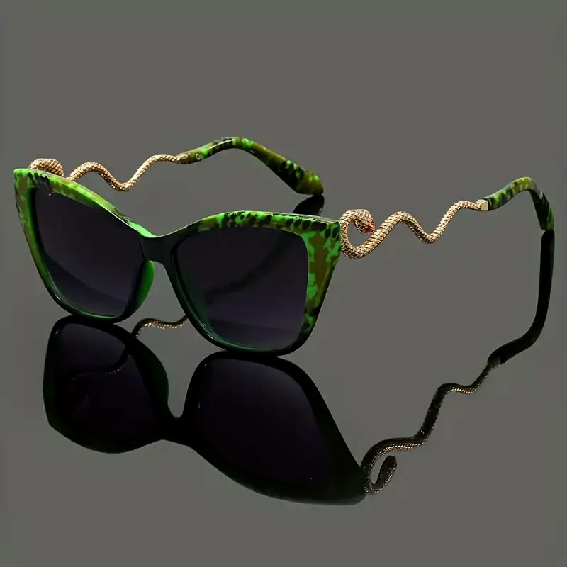 Oversized cat-eye frames finished in bold acetate, matched with sculpted snake-inspired metal arms that curve neatly around the temples. Fitted with dark gradient lenses and UV400 protection for sharp vision and full sun defense.