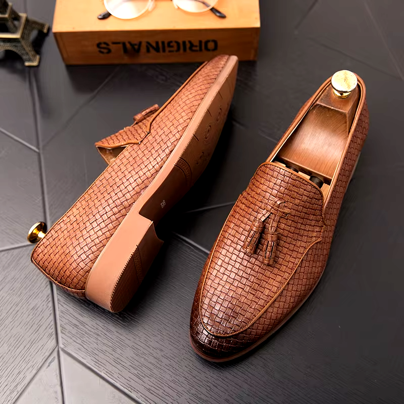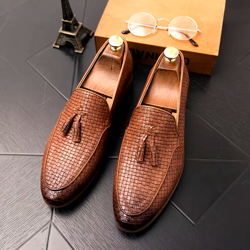 These textured leather loafers showcase intricate weave work and twin tassels for timeless sophistication with a modern edge. Designed with lightweight cushioning and a classic slip-on profile, so you can transition seamlessly from boardroom to after-hours.