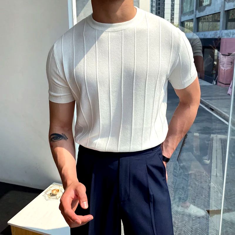 Jacquard stripe fit design, exudes a refined look with its ribbed cotton texture and slim silhouette, perfect for a modern look and timeless elegance.