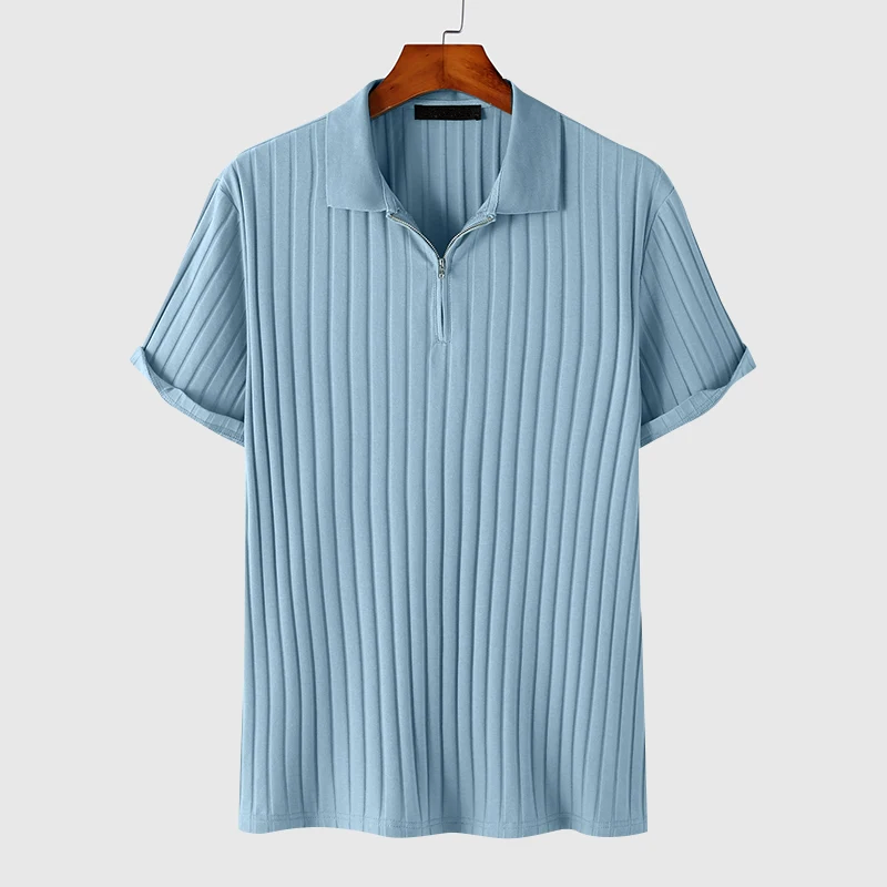A super soft knit polo featuring a textured, bold vertical ribbing pattern and a zipper placket. With short sleeves, lightweight and breathable fabric, you can stay cool in summer without feeling stuffy.