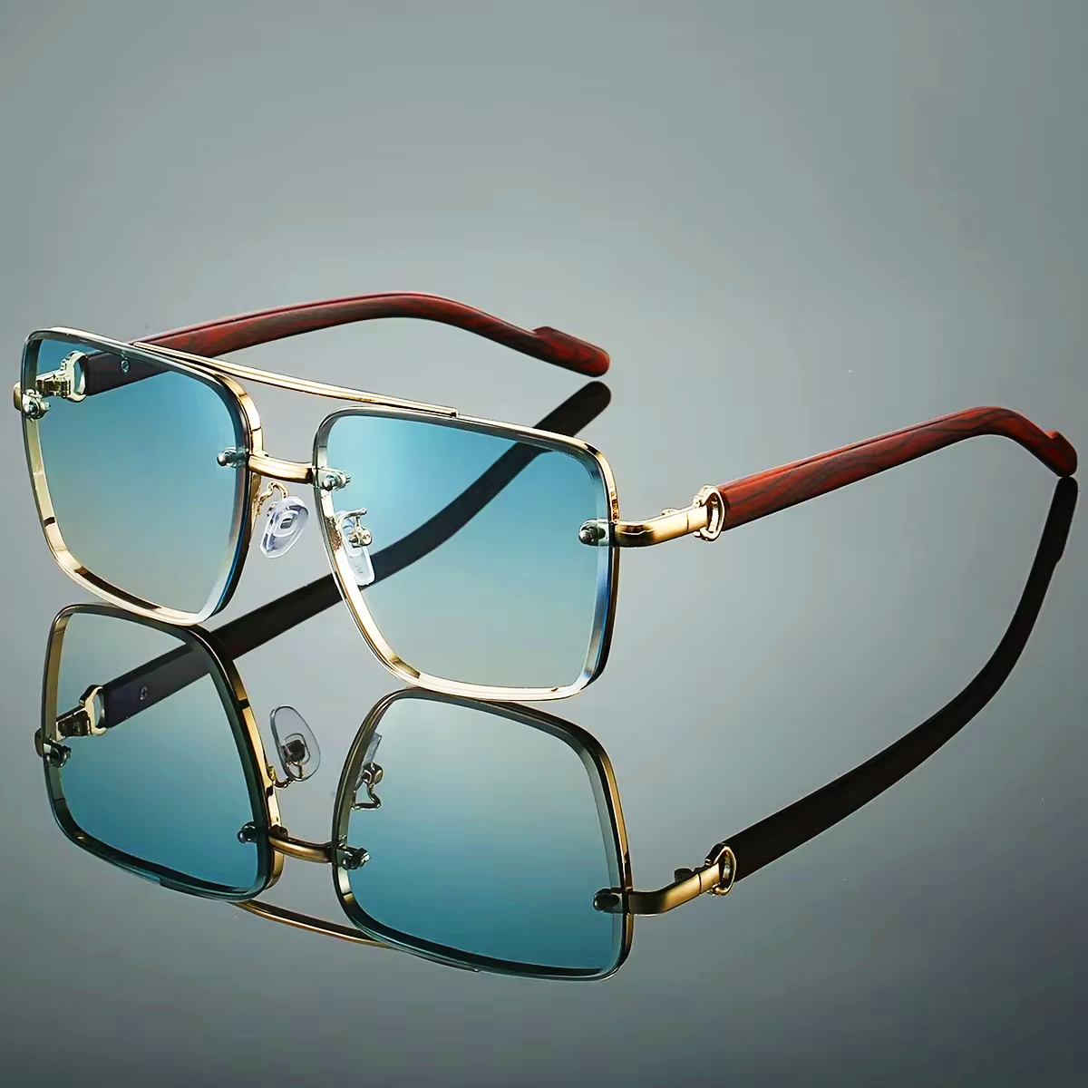 Structured square frame, gradient lenses, and polished gold rim channels timeless aviator charm, while the rich wood-grain temples and clean metal detailing offer a quiet nod to vintage luxury.