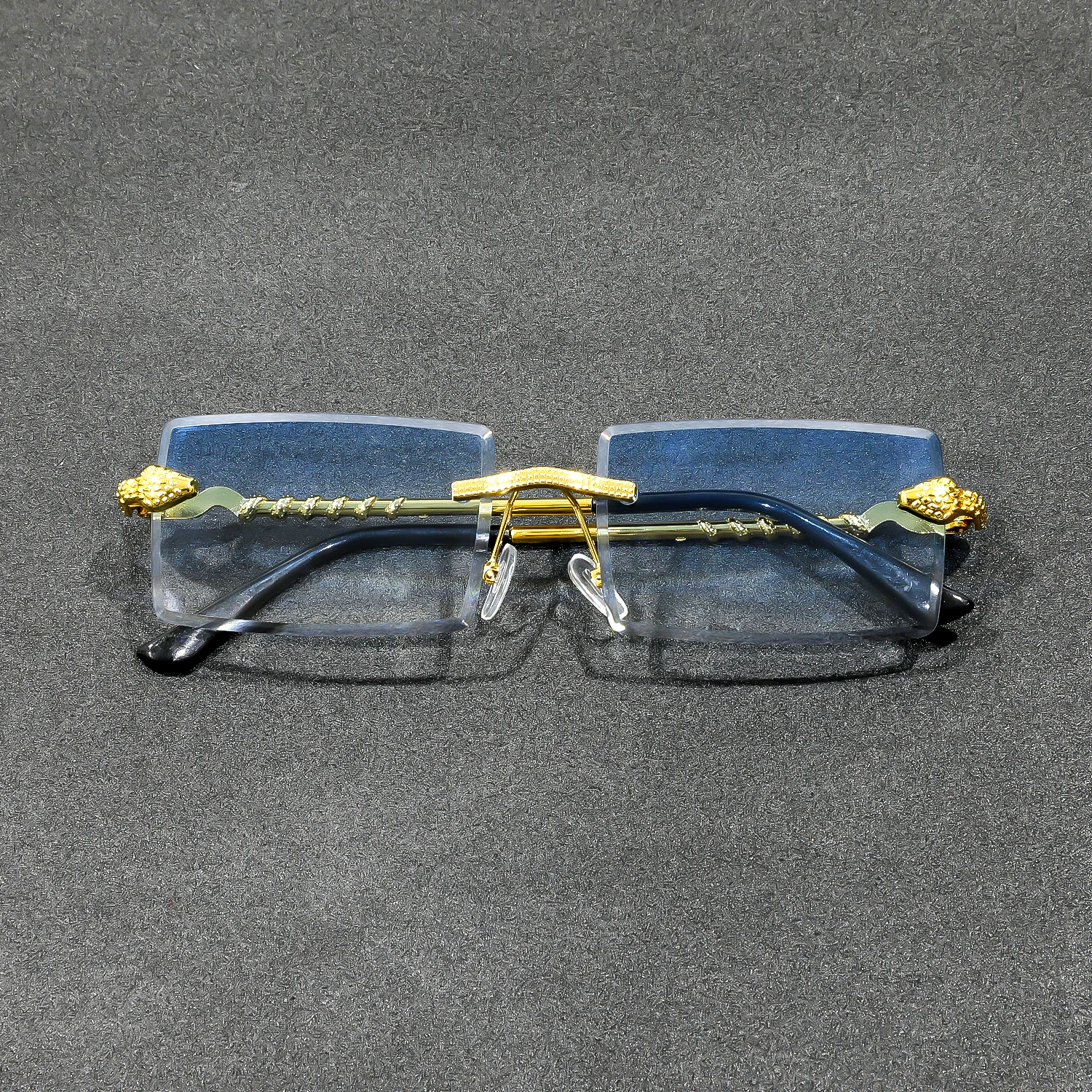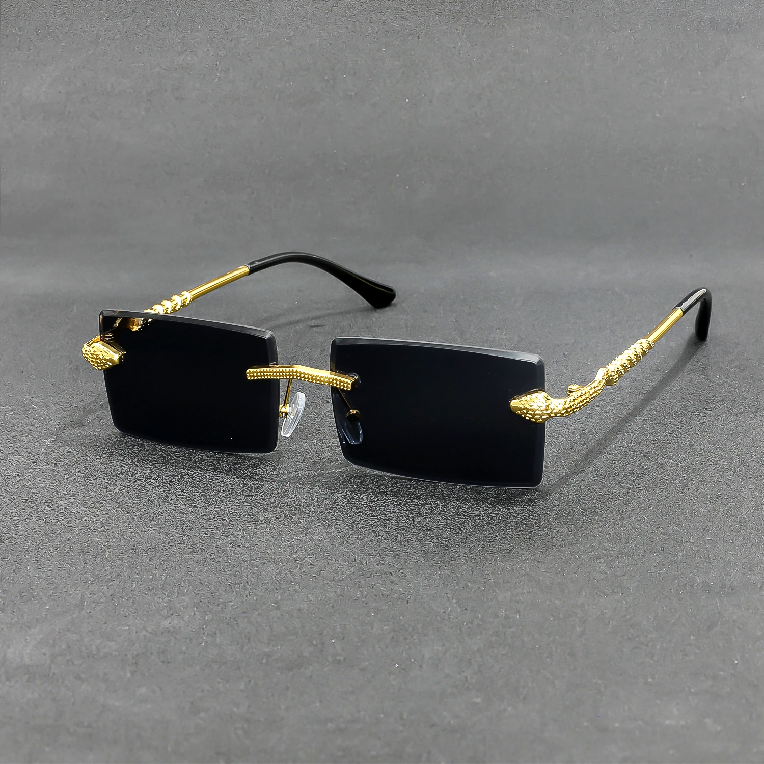 Distinctive rectangular lenses in a sleek rimless build, paired with sculpted golden temples that carry bold dragon detailing for a bold retro edge. Finished with tinted, UV400 scratch-resistant lenses, they’re built to cut daylight glare and glow effortlessly under city lights.
