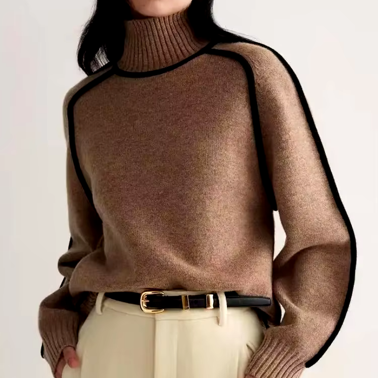 Bold contrasting seams, a ribbed turtleneck, and cozy cuffs bring a structured yet soft look to this sweater. Crafted for versatile elegance, its warm texture is perfect for both casual outings and office settings, pairing seamlessly with tailored pants or jeans.