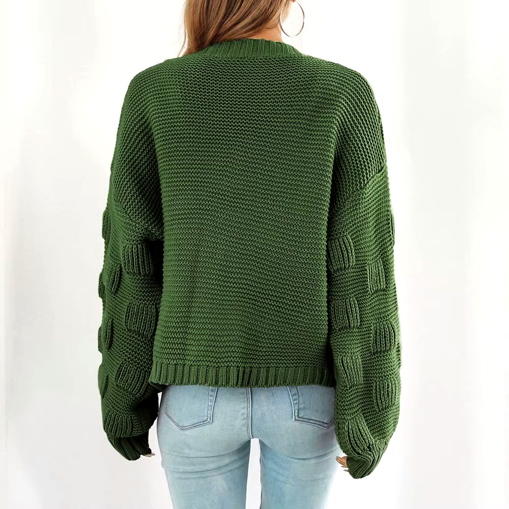 Chunky knit design that adds depth, complemented by textured bubble sleeves for a plush touch. Soft, breathable fabric and an oversize fit make it an easy layering essential for any season and pairs well with jeans, dresses, or loungewear.