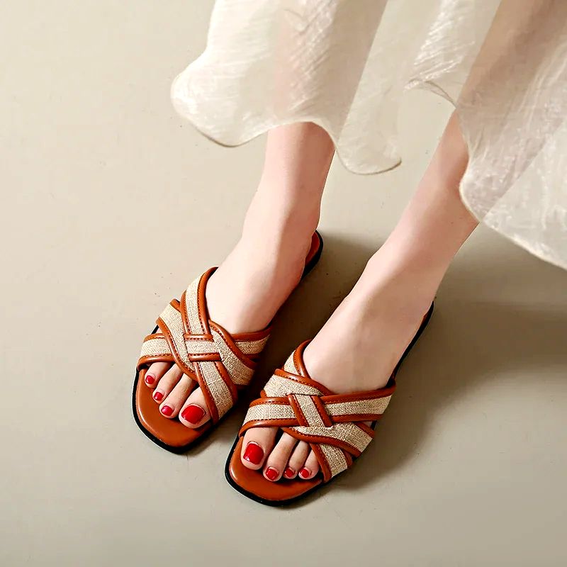 These slip-on slides feature crisscrossed braided straps in dual textures—faux leather and jute-look fabric, bringing artisan flair to everyday ease. The sculpted low heel adds subtle lift, and the neutral tones pair effortlessly with anything. Perfect for everything from weekend markets to city strolls.
